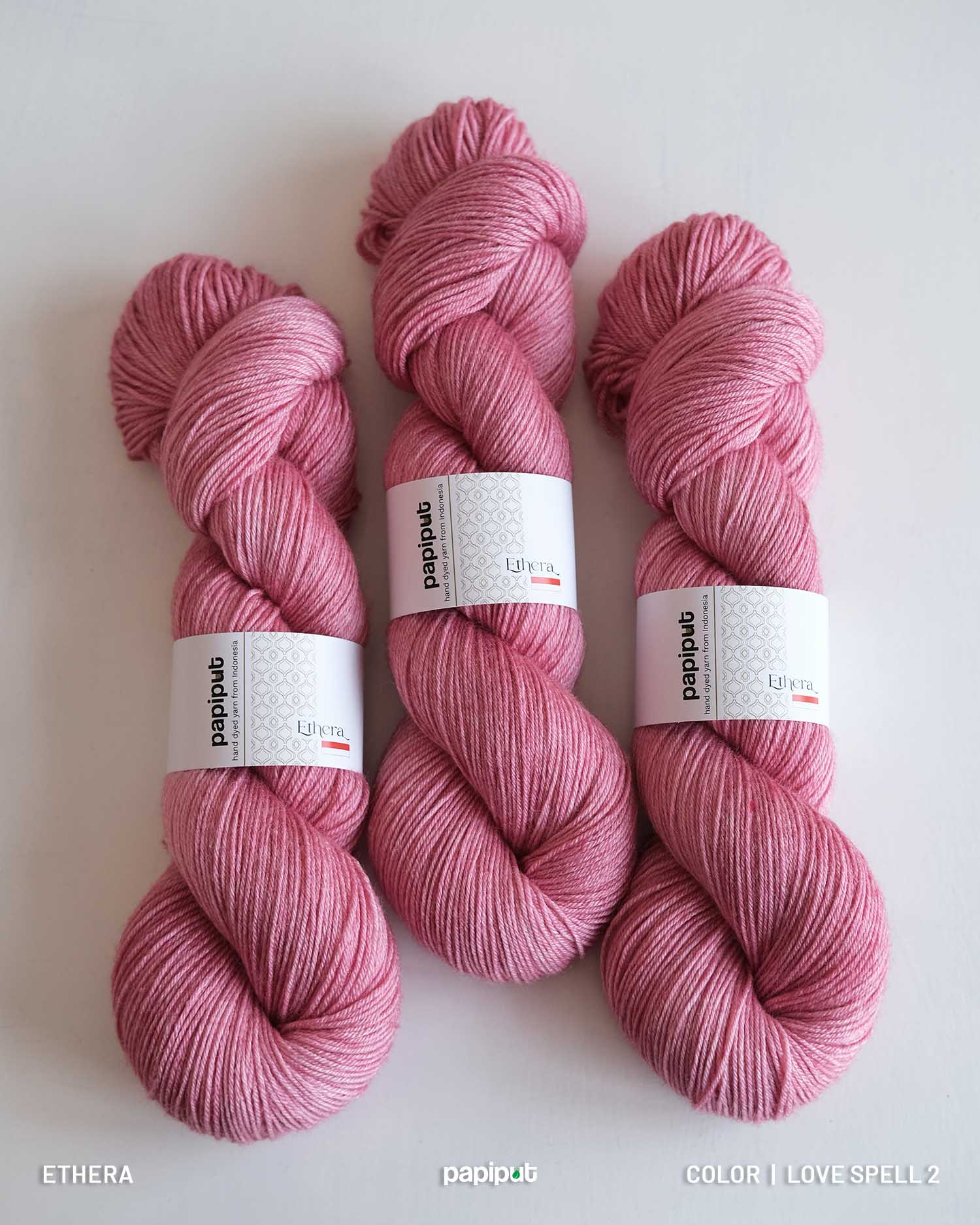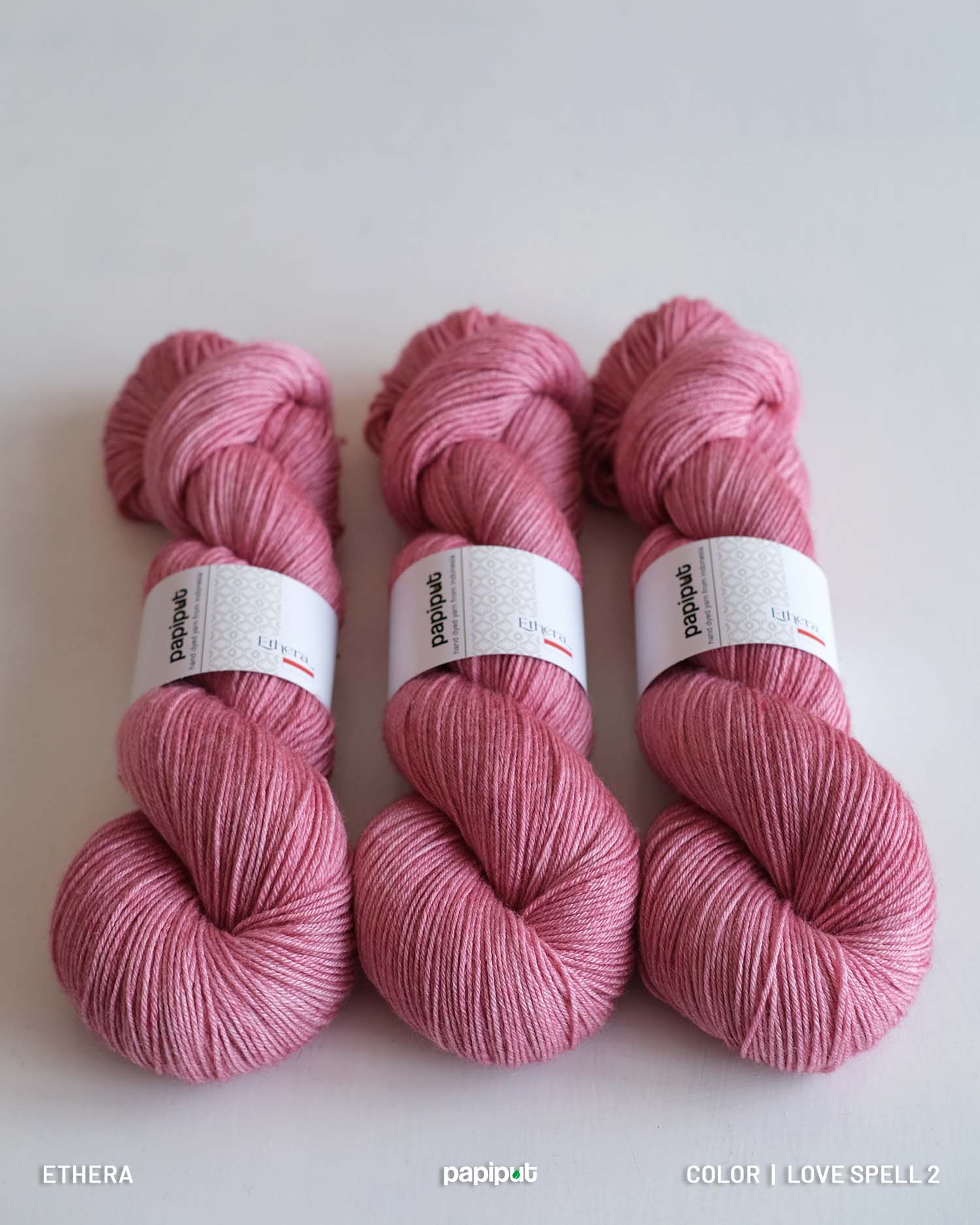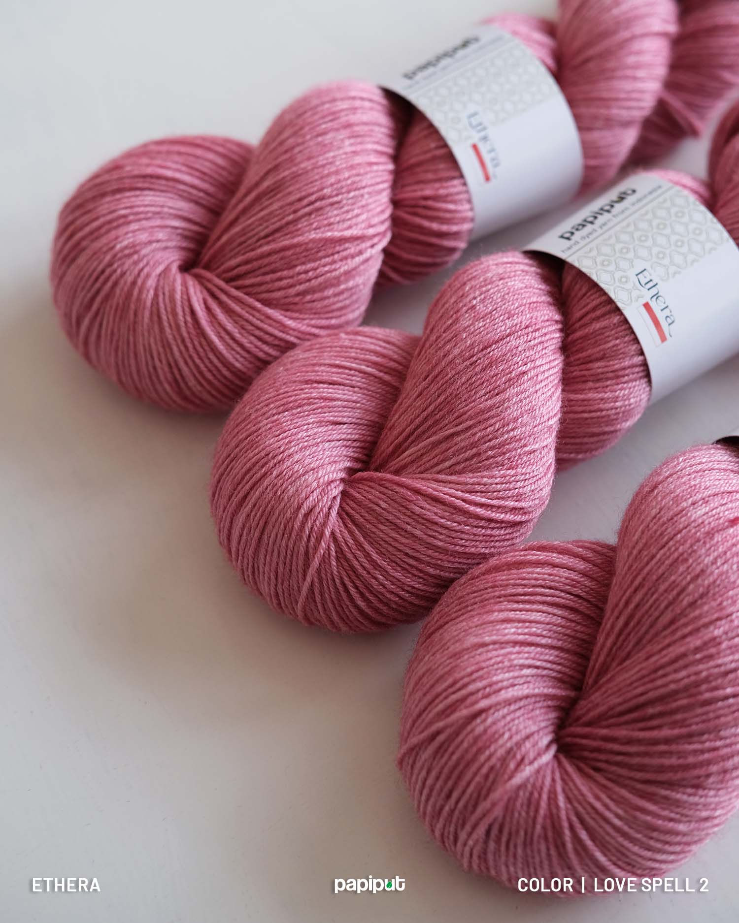 Benang ini sangat cocok untuk berbagai project iklim tropis, misalnya baju dan scarf/shawl. Gabungan serat merino dan bunga lotus menjadikan Ethera terasa lembut, lentur, halus, ringan, dan nyaman untuk dipakai bersentuhan langsung dengan kulit. Enak dirajut, stitch definition rapi, dan bagus untuk motif knitting pattern stockinette, lace, cable, colorwork, dan brioche.