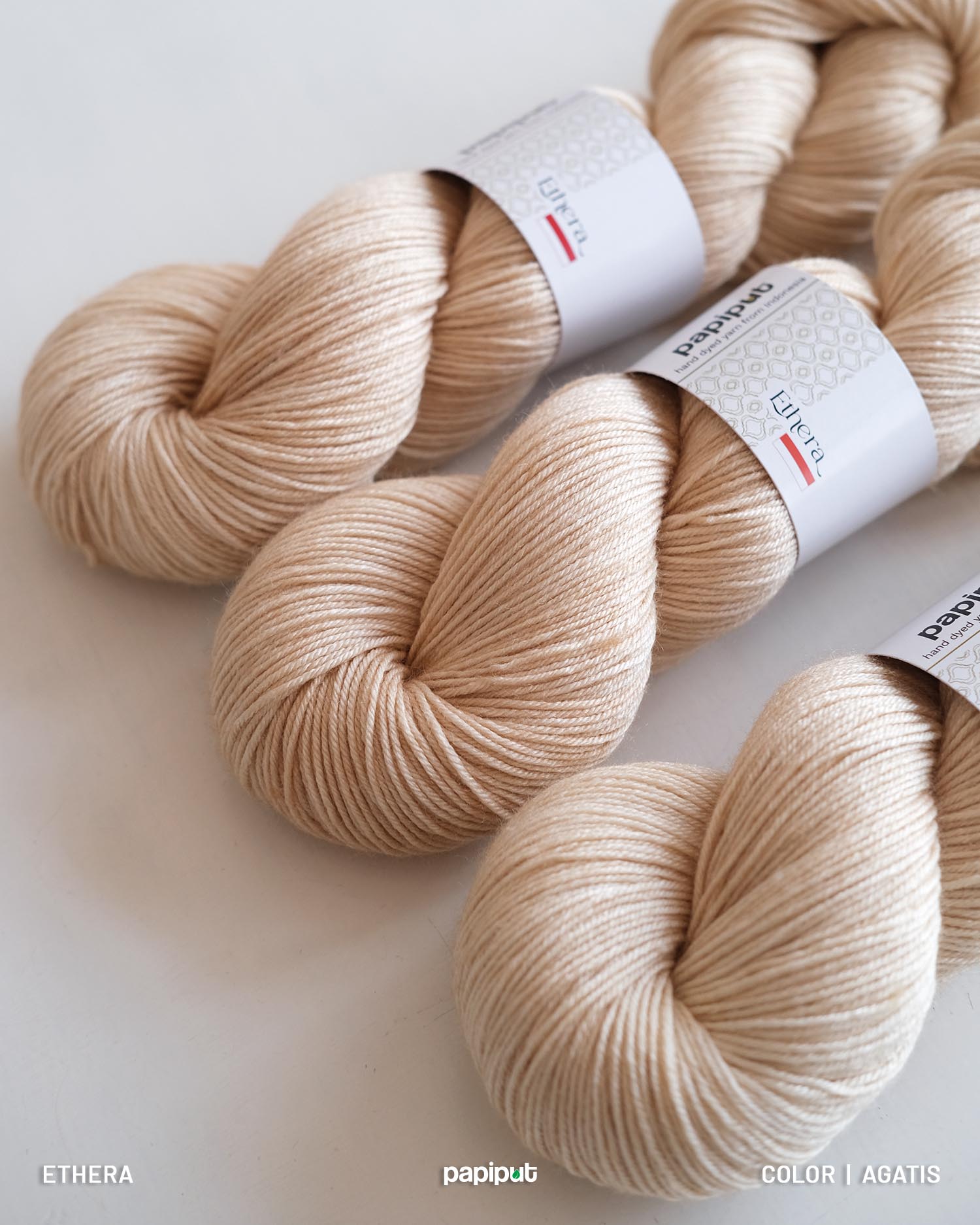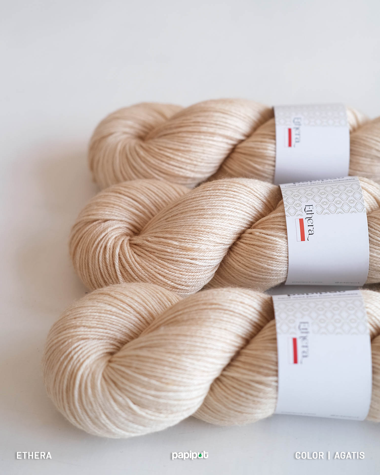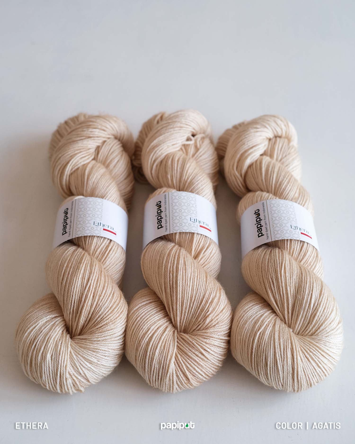 Benang ini sangat cocok untuk berbagai project iklim tropis, misalnya baju dan scarf/shawl. Gabungan serat merino dan bunga lotus menjadikan Ethera terasa lembut, lentur, halus, ringan, dan nyaman untuk dipakai bersentuhan langsung dengan kulit. Enak dirajut, stitch definition rapi, dan bagus untuk motif knitting pattern stockinette, lace, cable, colorwork, dan brioche.