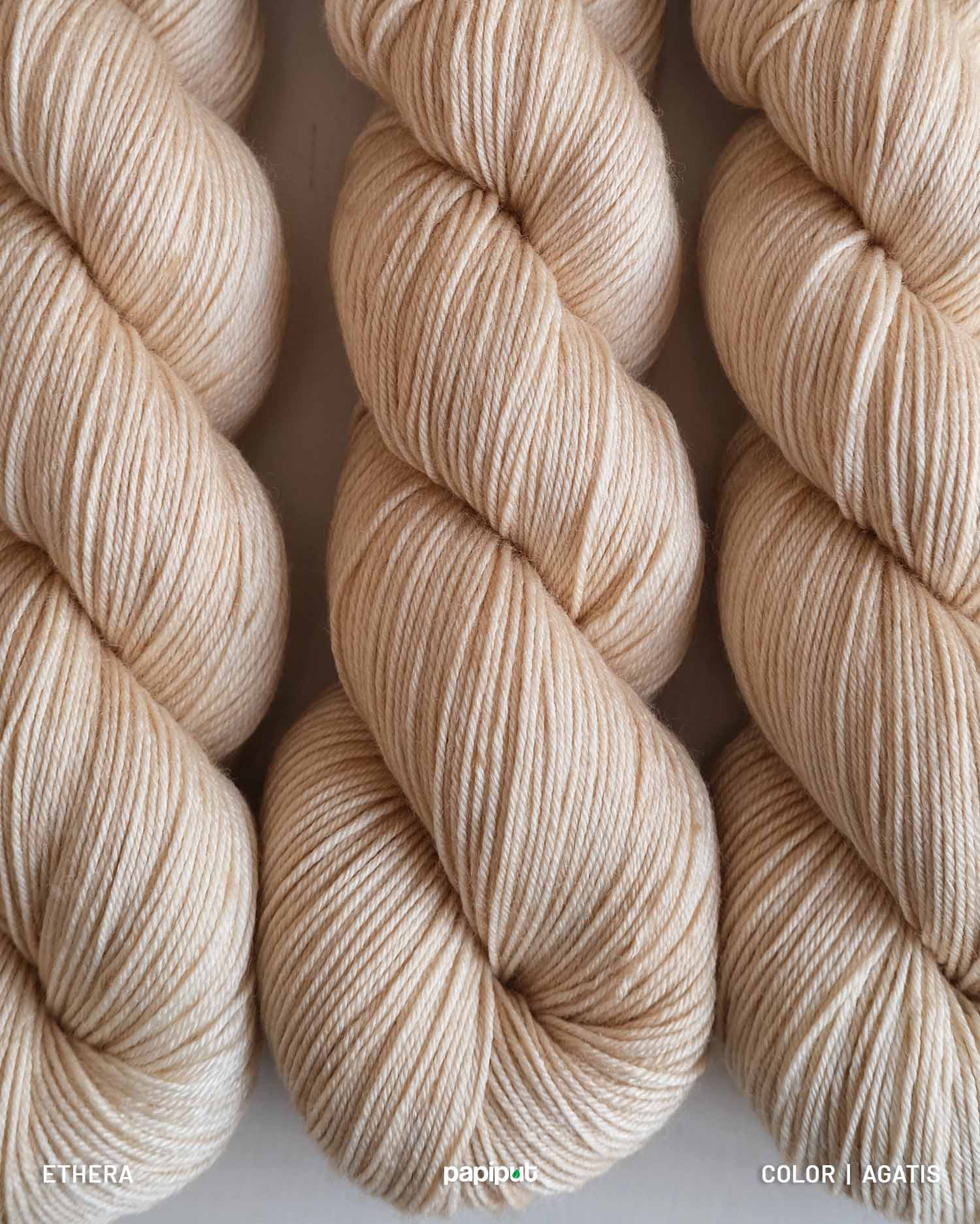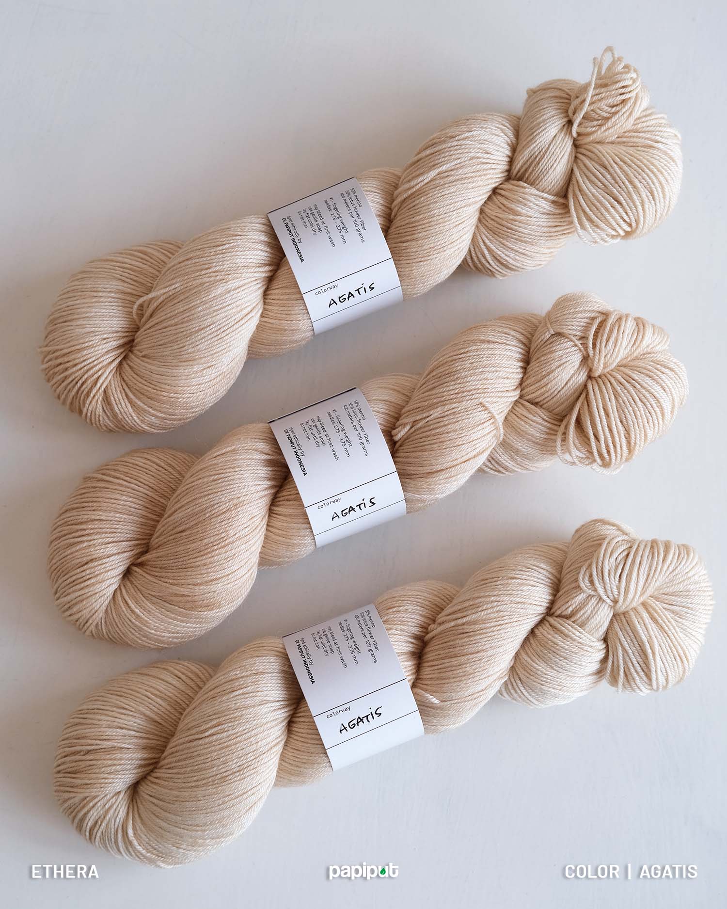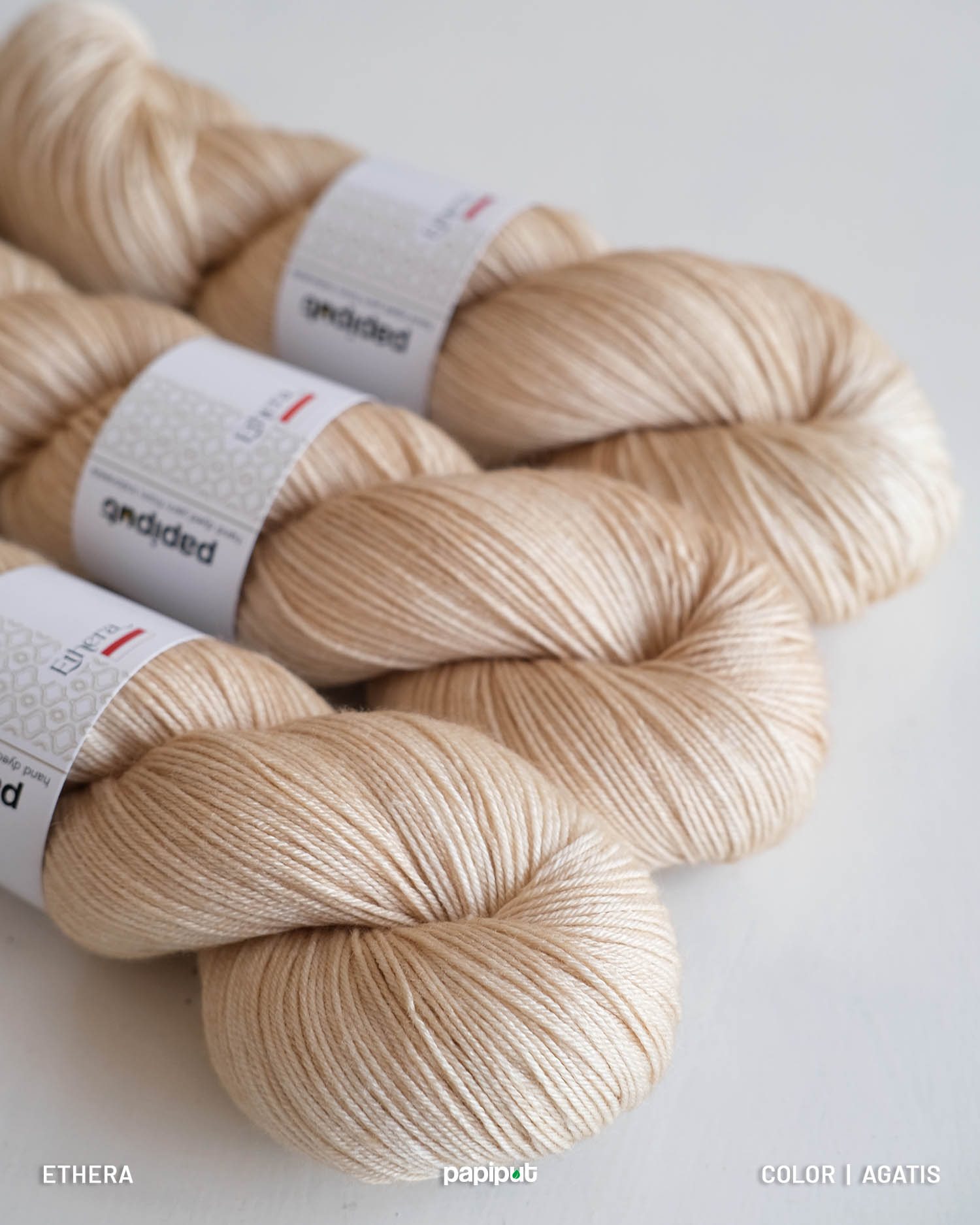 Benang ini sangat cocok untuk berbagai project iklim tropis, misalnya baju dan scarf/shawl. Gabungan serat merino dan bunga lotus menjadikan Ethera terasa lembut, lentur, halus, ringan, dan nyaman untuk dipakai bersentuhan langsung dengan kulit. Enak dirajut, stitch definition rapi, dan bagus untuk motif knitting pattern stockinette, lace, cable, colorwork, dan brioche.