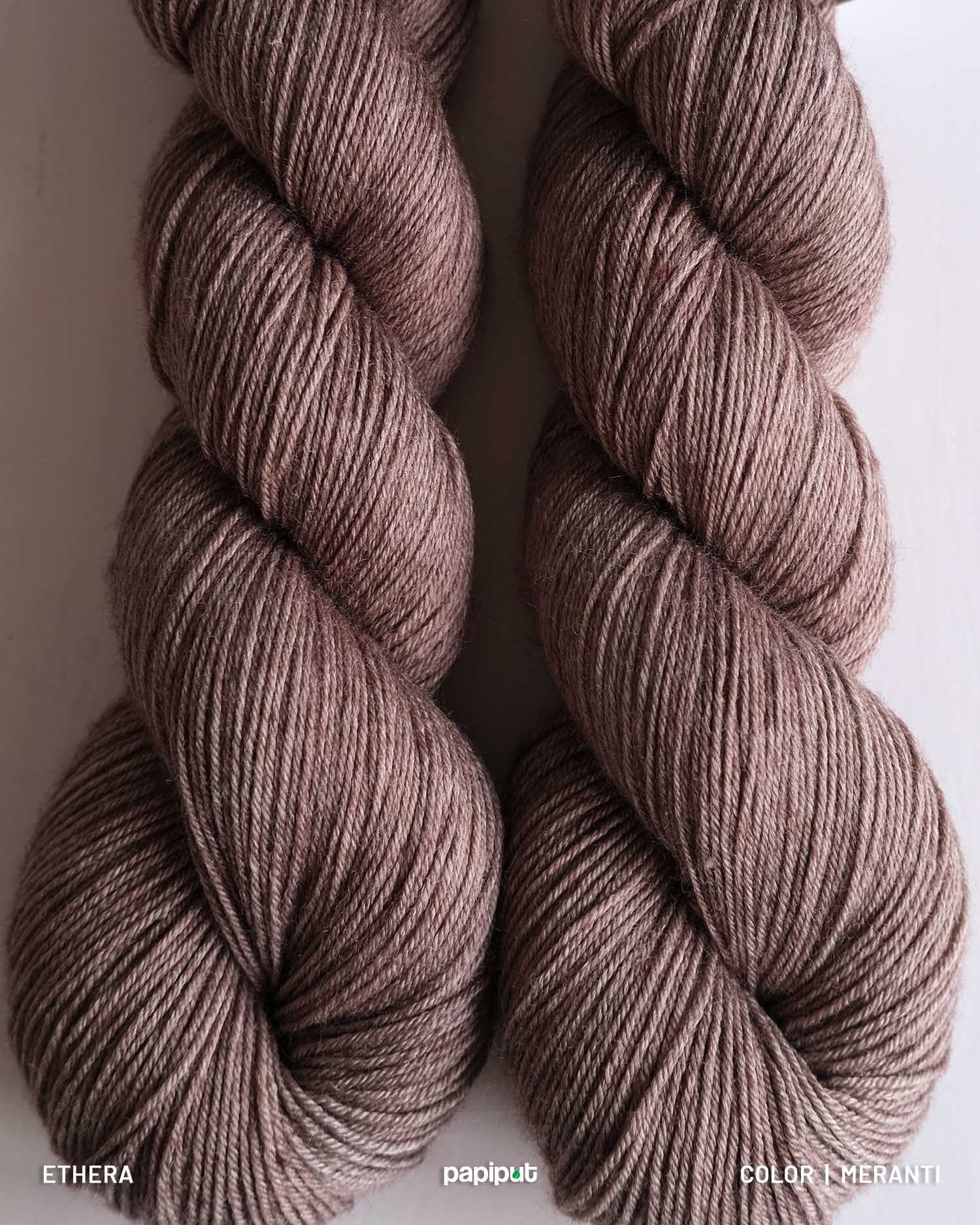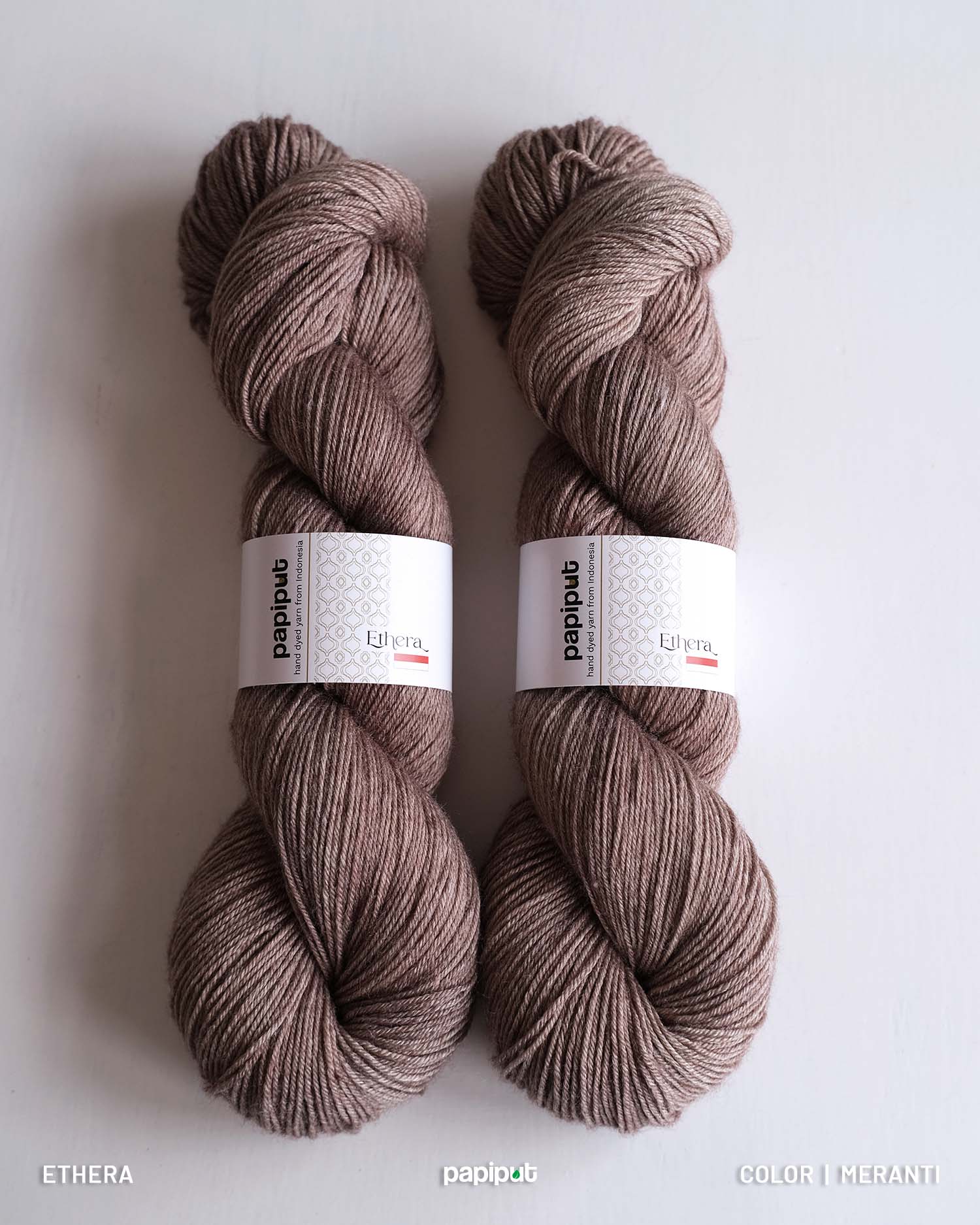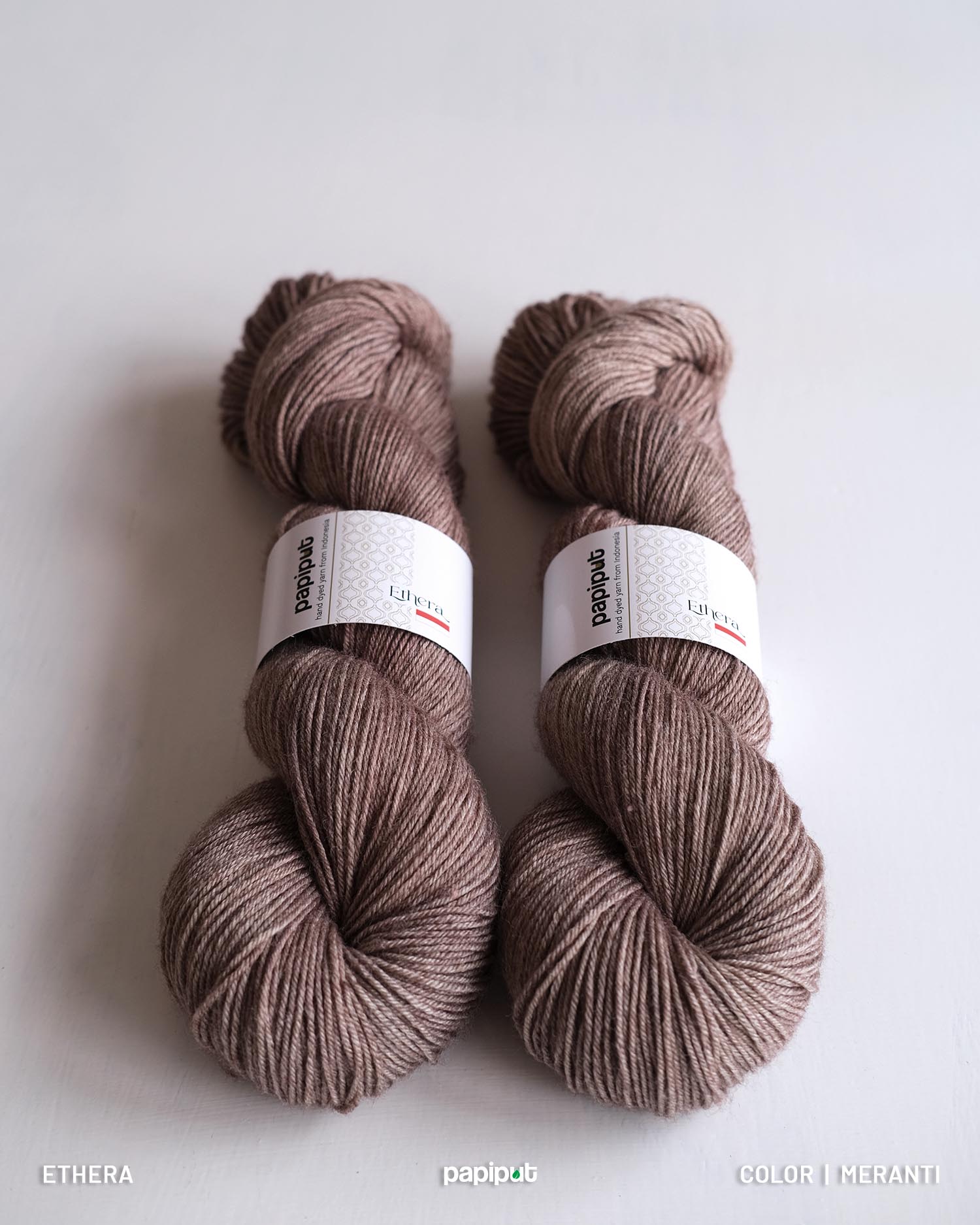 Benang rajut hand dyed semi-solid warna cokelat tua.
