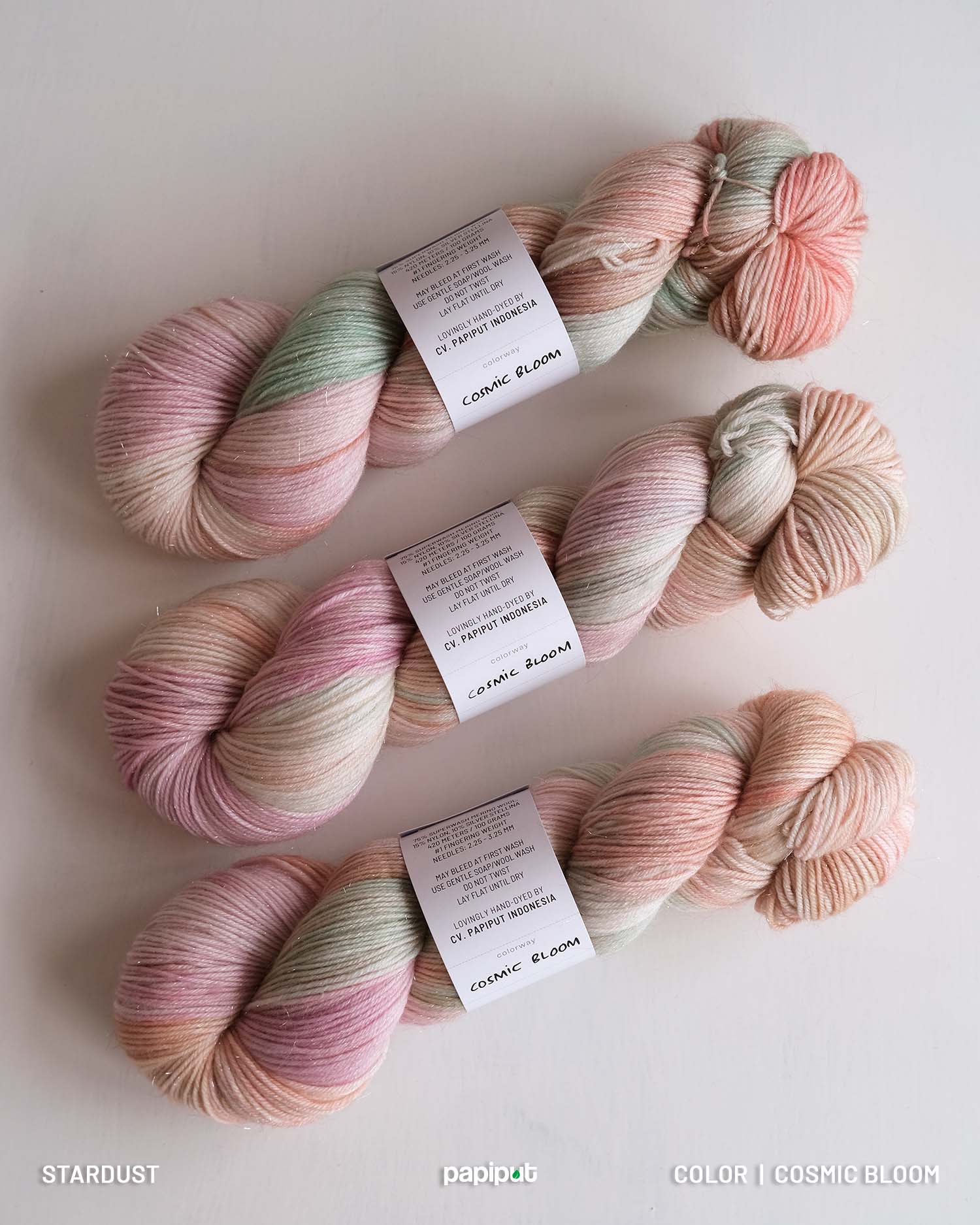 Mohon diperhatikan bahwa benang-benang hand-dyed adalah unik. Tidak ada warna yang benar-benar sama walaupun diproses dalam batch yang sama. Kami mewarnai benang sebanyak 3 gulung per batch. Pastikan kamu memesan benang sesuai dengan kebutuhan Anda untuk menghindari perbedaan warna yang terlalu jauh.