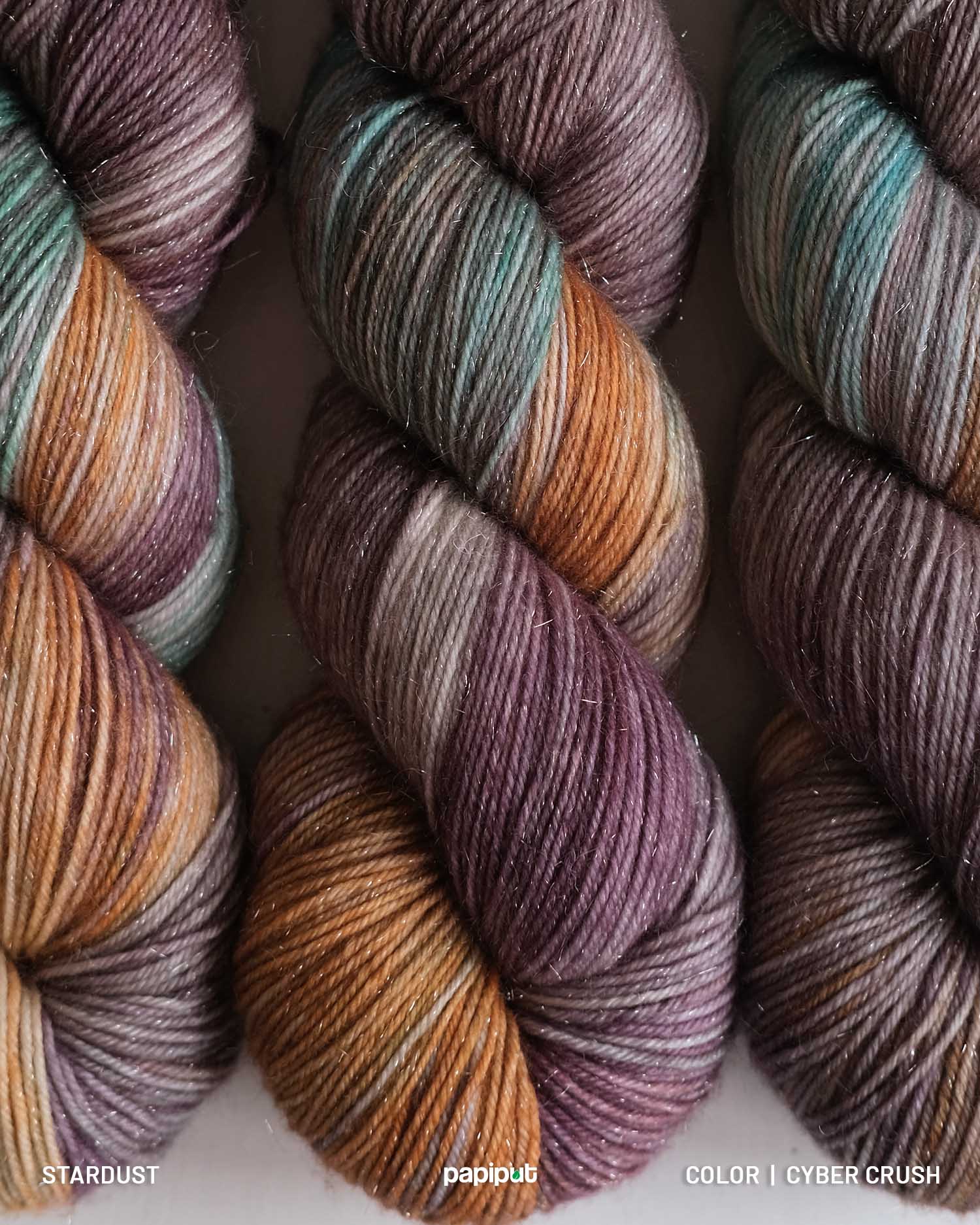 Benang rajut hand-dyed multicolor warna ungu, abu-abu, teal, dan burnt orange.