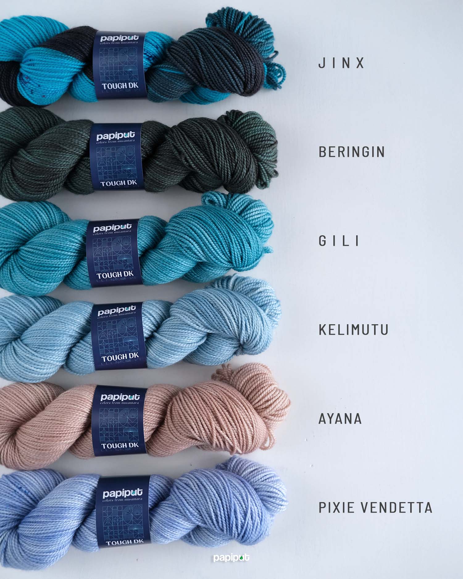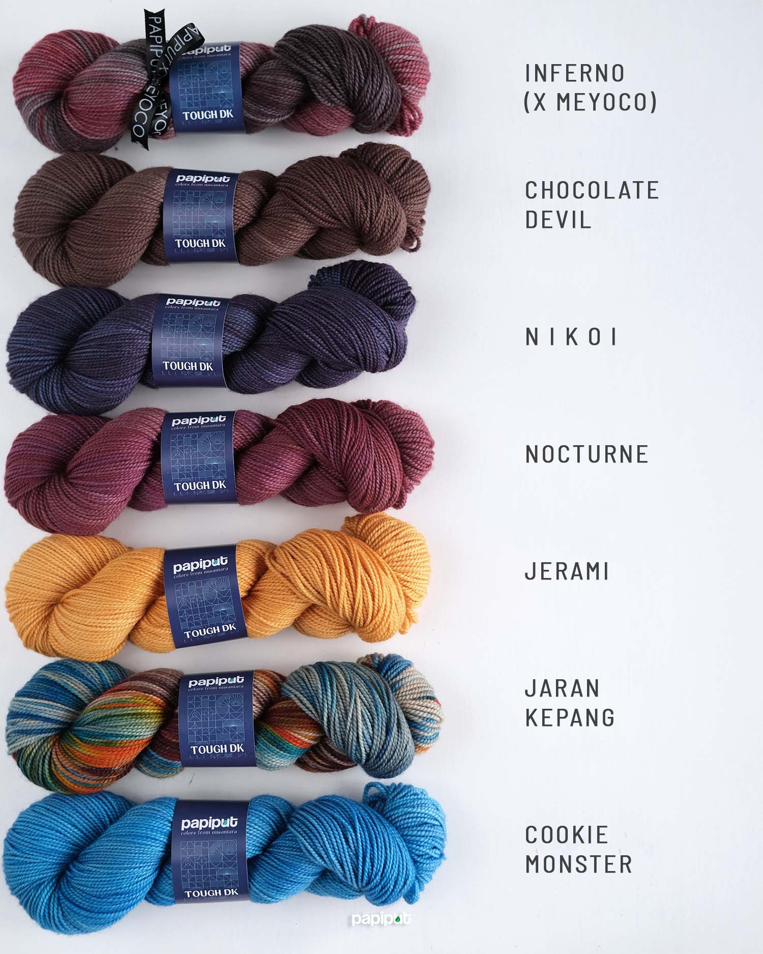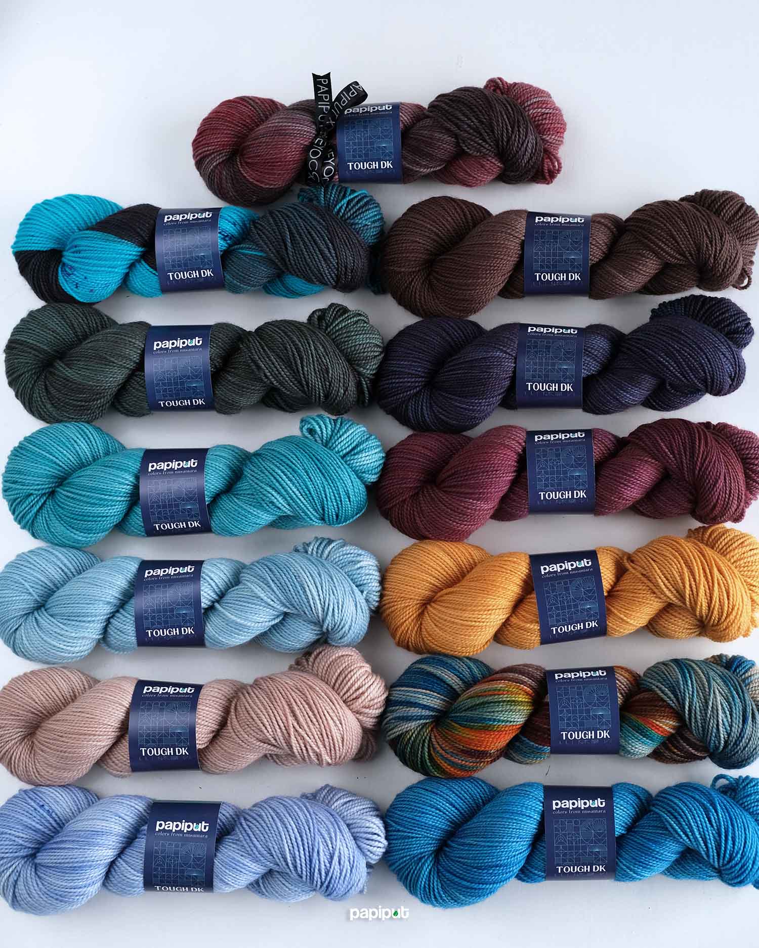 Tough DK adalah benang Papiput yang paling kenyal dan lentur. Lembut dan nyaman untuk berbagai proyek yang bersentuhan langsung dengan kulit, serta menghasilkan stitch definition yang rapi.